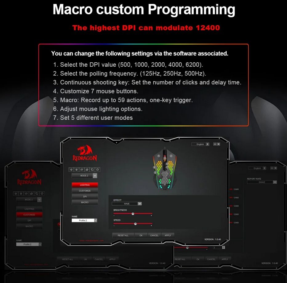 * 12400 DPI via software (500/1000/2000/3000/6200/12400 DPI user adjustable)