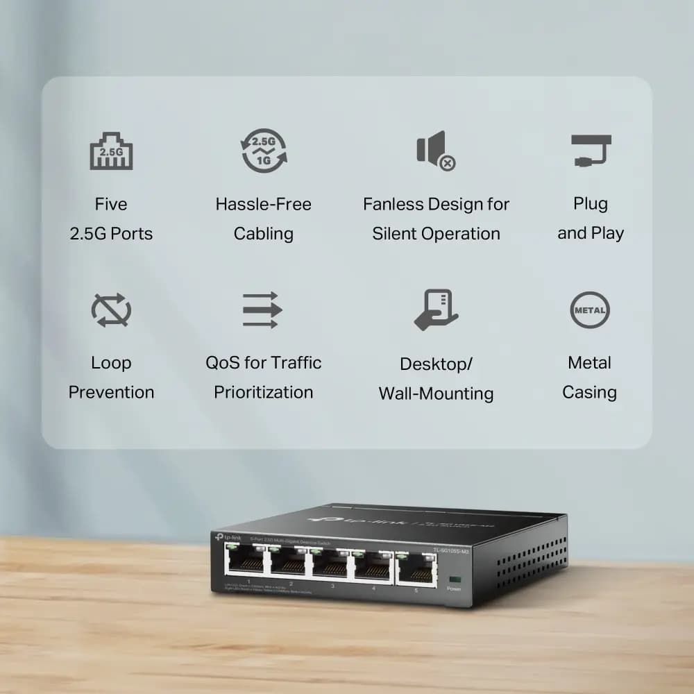 5 × 2.5 Gigabit პორტი – ხუთი 2.5 Gbps პორტი უზრუნველყოფს Multi-Gig მოწყობილობების სრულ წარმადობას და 25 Gbps switching ტევადობას.